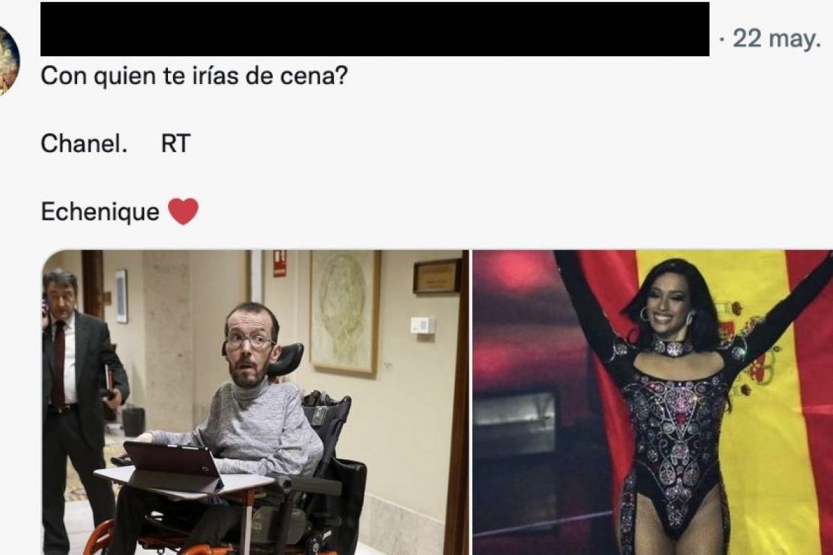 En el mensaje, el tuitero había subido dos fotos: una del propio Echenique y otra de Chanel, representante de España en Eurovisión. ”¿Con quién te irías de cena?”, preguntó, a modo de encuesta. Para elegir al político había que dale a ‘me gusta’ y para elegir a la cantante, hacer un retuit.