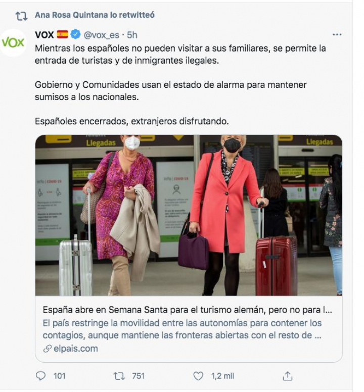 El líder de Podemos ha recordado que Quintana retuiteó un mensaje del partido de ultraderecha Vox en el que el partido de Santiago Abascal acusaba al Gobierno central y a las comunidades autónomas de prohibir a “los españoles” visitar a sus familiares y permitir “la entrada de turistas y de inmigrantes ilegales”.
