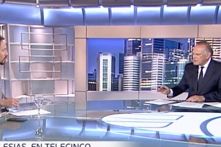 El líder de Podemos, Pablo Iglesias, fue entrevistado este lunes por Pedro Piqueras en Informativos Telecinco horas antes de su reunión con el presidente del Gobierno, Pedro Sánchez, para negociar la investidura.