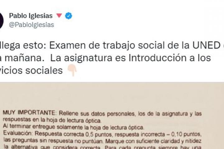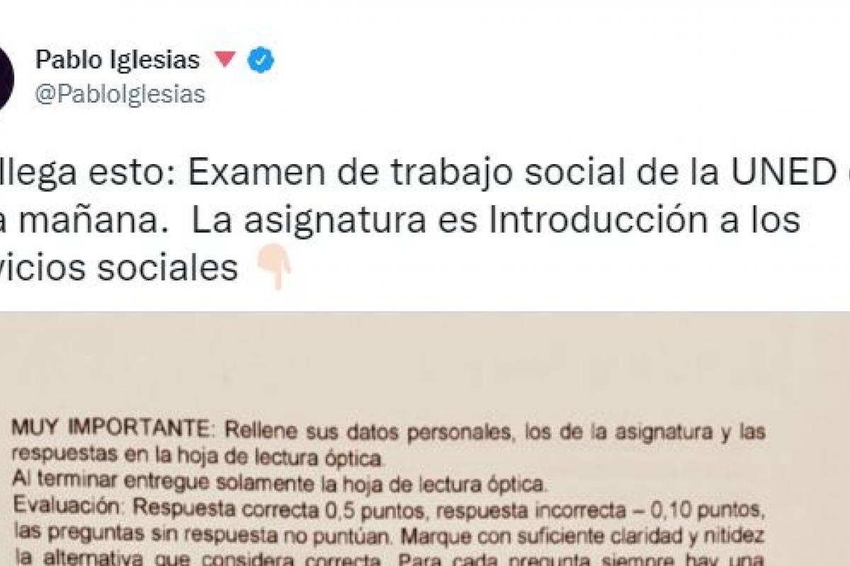 El exvicepresidente del Gobierno y líder de Unidas Podemos, Pablo Iglesias, ha compartido en su cuenta de Twitter la pregunta que ha hecho la UNED durante un examen de la asignatura de Introducción a los servicios sociales de Trabajo Social.