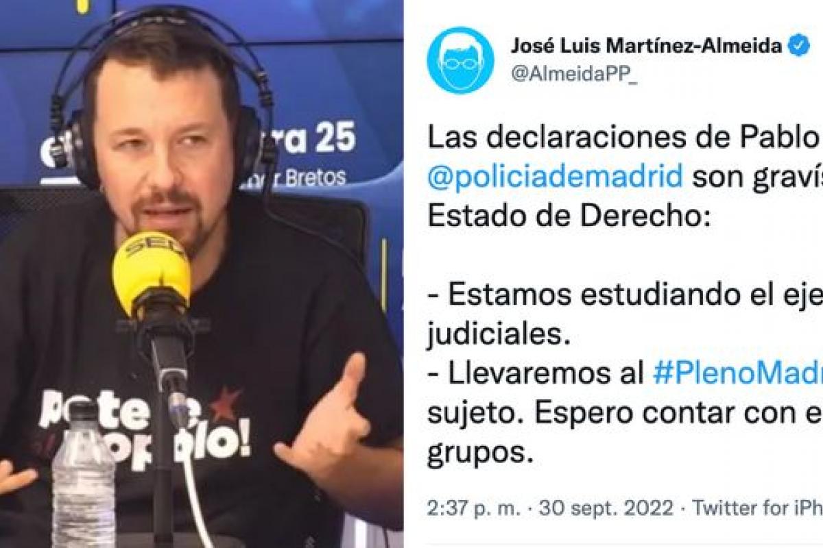 Unas palabras que ha recogido el alcalde de Madrid, que ha escrito en Twitter: “Las declaraciones de Pablo Iglesias sobre @policiademadrid son gravísimas e inaceptables en un Estado de Derecho: - Estamos estudiando el ejercicio de acciones judiciales. - Llevaremos al #PlenoMadrid la reprobación de este sujeto. Espero contar con el apoyo de todos los grupos”.