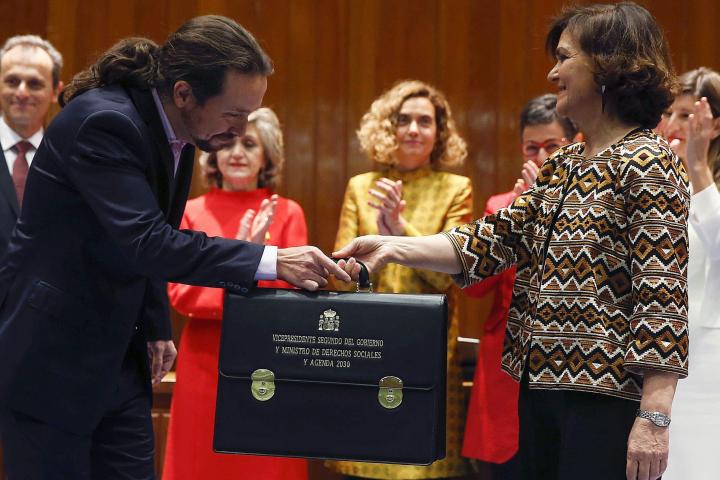 Iglesias ha tomado posesión de la cartera, entre fuertes aplausos y gritos de “sí se puede”, de manos de la vicepresidenta del Gobierno, Carmen Calvo, quien le ha dicho: “Haremos un tándem importante de trabajo porque en ti va a recaer una parte verdaderamente preciada de las políticas de un gobierno progresista como somos”.