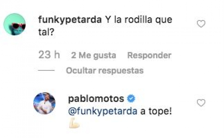 Al usuario FunkyPetarda, que la había preguntado por el estado de la rodilla, Motos le ha respondido con un “a tope” y el emoticono de fuerza