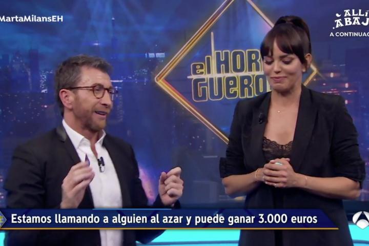 La actriz Marta Milans, la invitada a El Hormiguero (Antena 3) este martes, vivió un momento para la historia. La llamada a un ciudadano que acostumbra a hacer Pablo Motos, el presentador, y la invitada para darle 3.000 euros tuvo esta vez una receptora que triunfó por su espontaneidad.