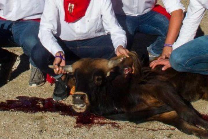 Para visibilizar el "maltrato" que se inflige a estos animales, ha documentado además una becerrada que tuvo lugar recientemente en San Rafael, un núcleo urbano perteneciente a El Espinar (Segovia), cuyo vídeo puedes ver al inicio de esta noticia. En él puede verse cómo los vecinos "amedrentan, reducen, banderillean, apuñalan y acaban con la vida de animales de entre uno y dos años de edad", mientras se ríen de lo que están haciendo.