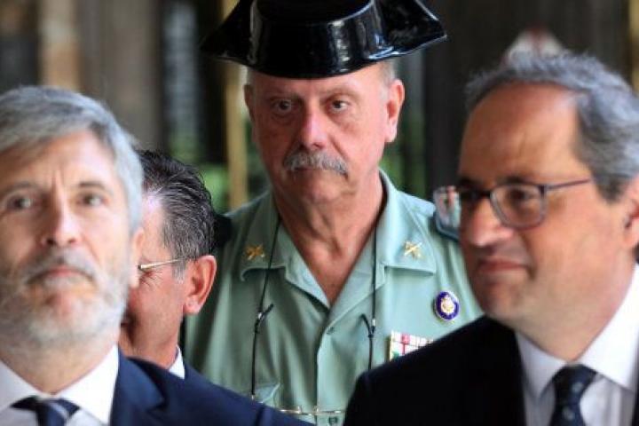 Preguntado por si este pacto incluye retirar lazos amarillos y pancartas de edificios como la que hay en la fachada de la Generalitat, Marlaska ha respondido que un "buen elemento a valorar" es la sentencia del Tribunal Superior de Justicia de Catalunya del 5 de julio.
