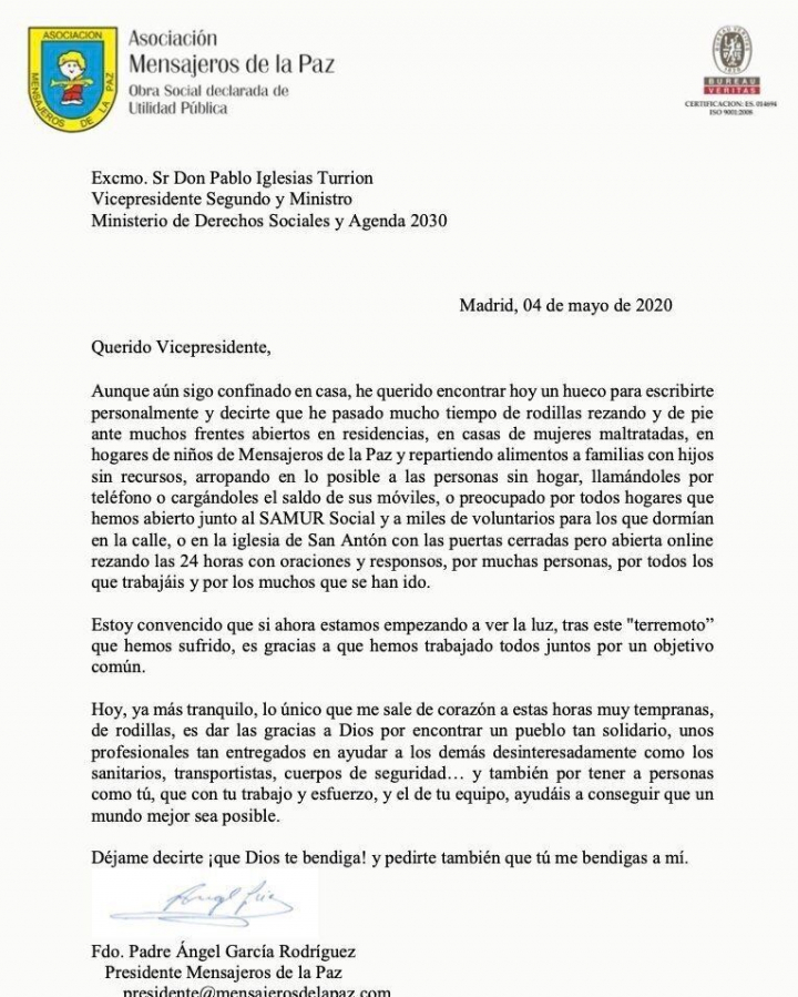 Así arranca la carta que le ha mandado el padre Ángel al vicepresidente segundo de Derechos Sociales y Agenda 2030, Pablo Iglesias, en la que le transmite sus gracias por las acciones aprobadas durante la pandemia.