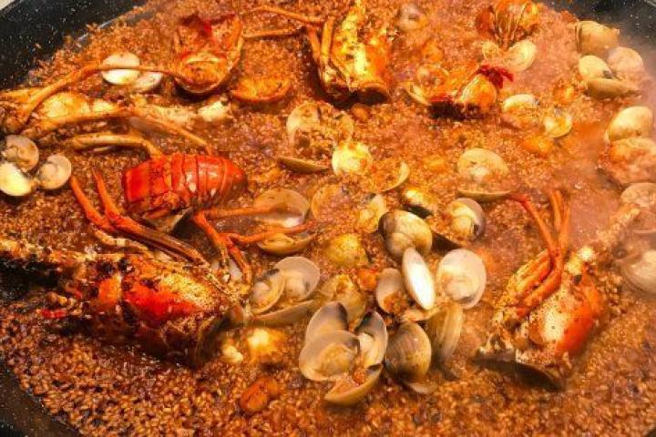 Poner en el fuego (gas, leña...) una paellera de 70 centímetros de diámetro (muy importante que el fuego/calor cubra bien la paellera para que el arroz se cocine uniforme y bien extendido). Añadir el aceite de oliva y, una vez caliente, añadir los medallones de langosta. Sofreírlos bien durante 3 o 4 minutos. Bajar el fuego, retirar los medallones, incorporar el arroz a la paella, rehogar el arroz unos segundos, añadir las almejas y cubrir con al caldo anterior. La proporción de caldo será el doble de arroz, aunque a veces puede ser un poco más dependiendo del tipo de arroz y su calidad.