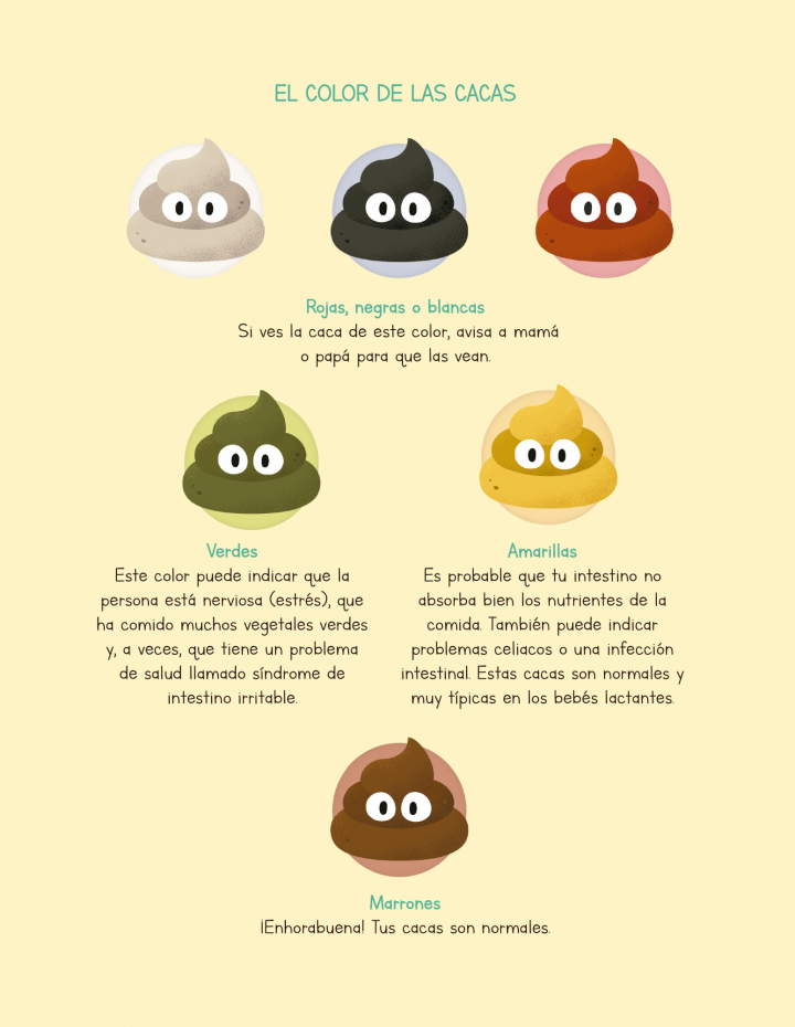 Aunque pueda parecerte que no es un gran tema de conversación con tu hijo, lo cierto es que las cacas dan mucha información y no todas son iguales. En Sanotes, sanitos la protagonista, Valentina, aprende cómo se forman las cacas a partir de los restos que han llegado hasta el intestino grueso, así como la forma y el color que estas deberían tener de manera normal. Libérate de tus prejuicios, ¡podemos aprender mucho de ellas!