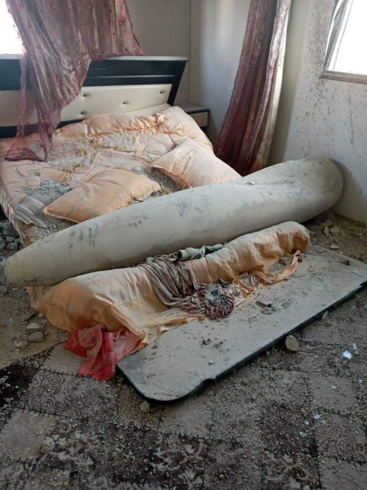 Llega al WathsApp una imagen. Es un misil sobre un colchón que atravesó una pared. Se quedó entero, entre las sábanas y unos cojines. “Mira, este cohete Israelí cayó en la casa de una familia en Khan Yunis. Estaban unas 30 personas de una familia acogidas en una casa, porque les habían bombardeado las suyas. Escucharon el sonido de los vidrios rotos de las ventanas y los gritos de los hijos. El cohete no explotó, pero si hubieran estado quienes dormían en ese cuarto ahora estarían muertos”, envía a continuación Iptisam.