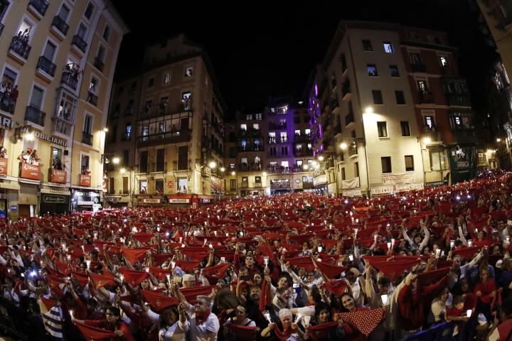 Un año más ha sido multitudinaria la asistencia de pamploneses y visitantes, que se han repartido en el lugar oficial del acto, la plaza Consistorial, y en otros espacios abiertos como la plaza del Castillo o la plaza del Consejo, hasta donde han acudido pertrechados con velas encendidas y su pañuelo rojo aún al cuello.