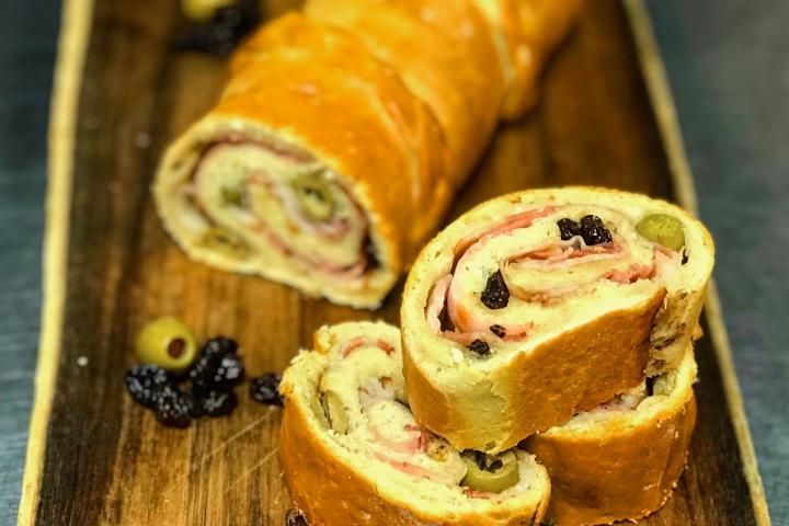 Espolvorear la mesa adonde se vaya a estirar la masa con un poco de la harina restante y estirarla con un rodillo (enharinar el rodillo bien). Formar un rectángulo de 45cm de largo por 20cm de ancho y de 5mm de grosor. Extender por encima laminas de jamón y bacon. Repartir las pasas y las aceitunas cortadas en laminas. Enrollar todo en forma de “chorizo”. Pasarlo a una bandeja de horno forrada con papel de hornear. Pintarlo con el huevo batido y hornearlo a 180ºC durante una hora aproximadamente.