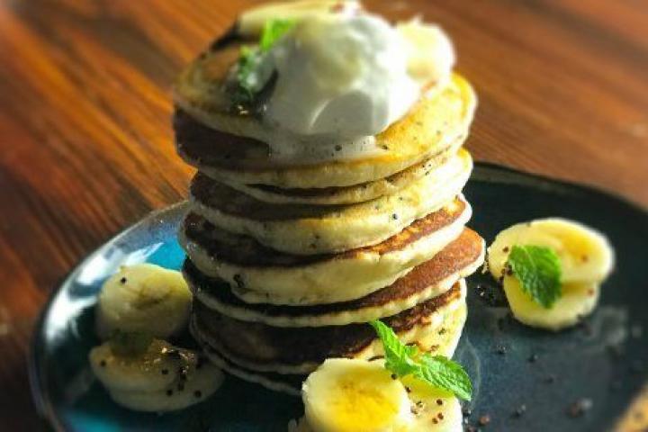 Pancakes de soja con coco, semillas de amapolas y bananas