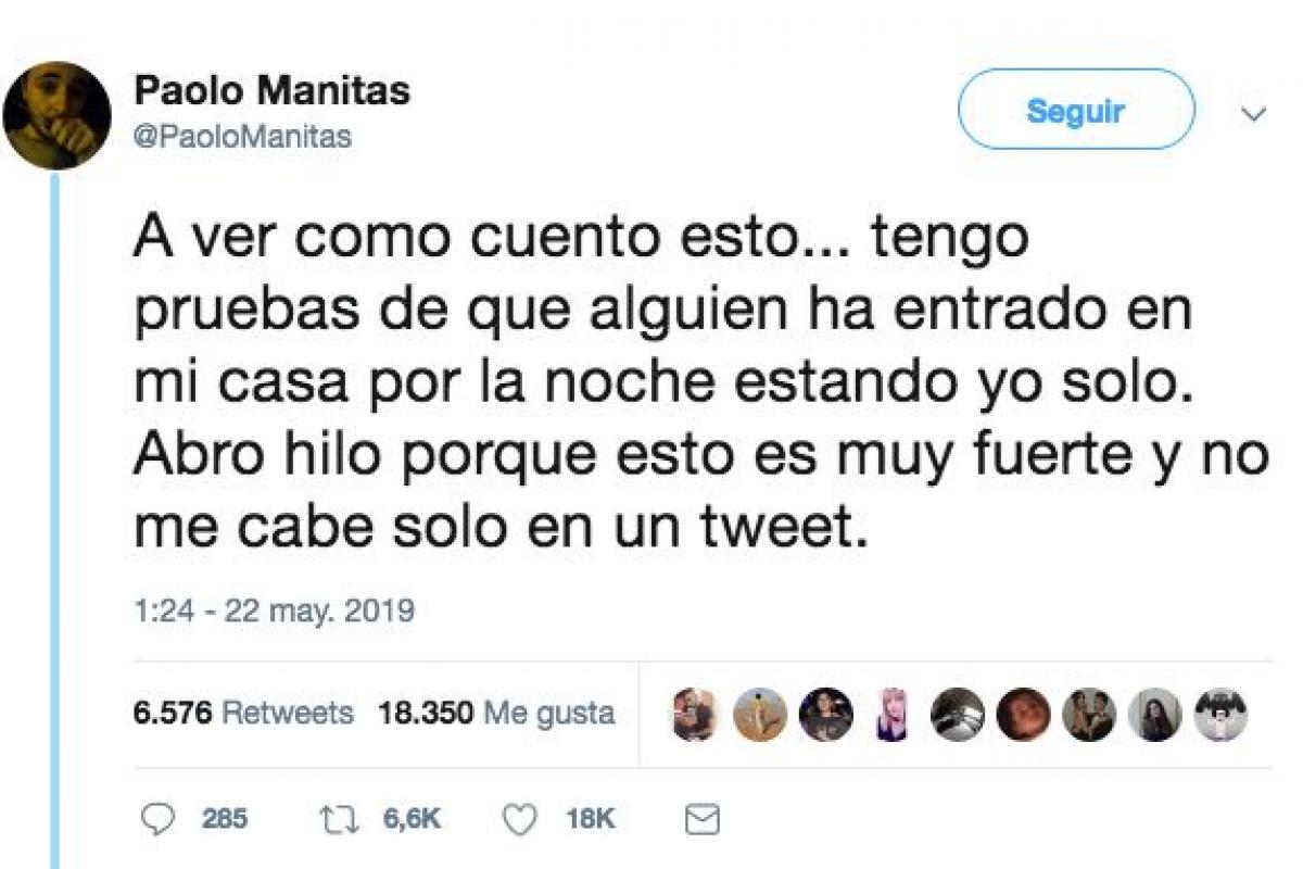 Manitas ha comenzado diciendo que tiene pruebas de que alguien ha entrado en su casa por la noche, cuando se encontraba solo. La historia, que ya acumula más de 7.000 retuits y 18.000 me gusta, no para de ganar adeptos.