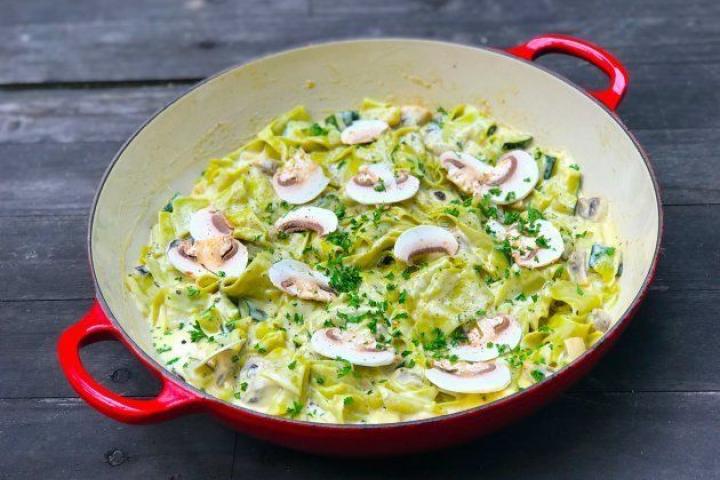 Pappardelle de espinacas con crema de hongos, trufa, calabacín, champiñones y burrata