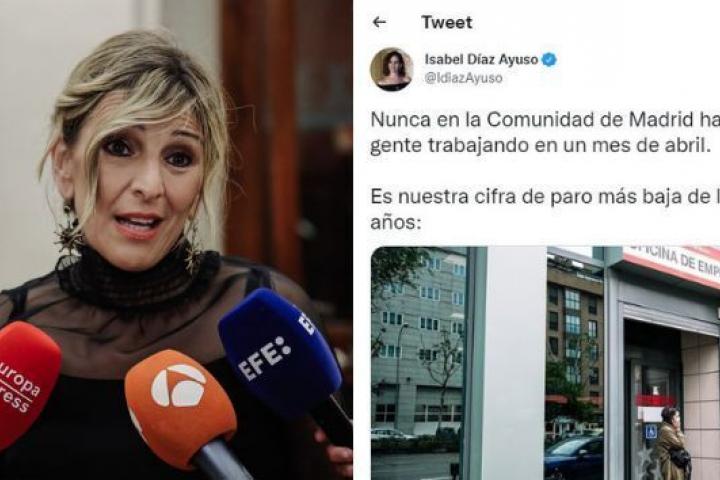 “Por Madrid, pero la tendencia es igual en todo el estado. Por tanto, son positivos”, ha zanjado Díaz, que hacía referencia a un tuit muy comentado de Ayuso en el que la presidenta de la Comunidad de Madrid afirmaba: “Nunca en la Comunidad de Madrid ha habido tanta gente trabajando en un mes de abril. Es nuestra cifra de paro más baja de los últimos 14 años”.