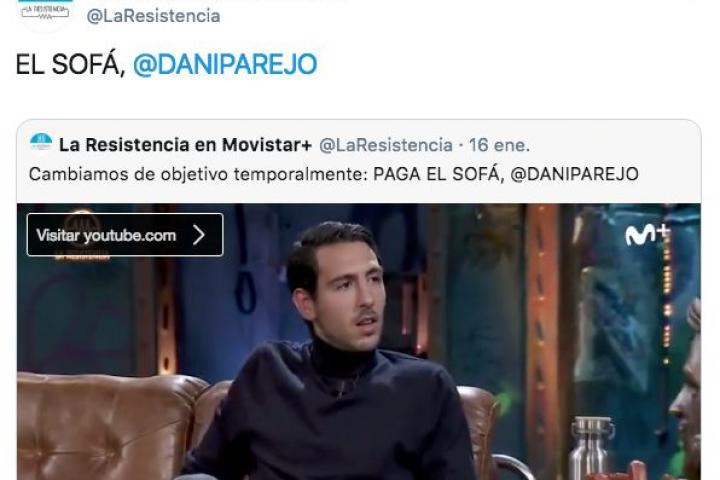Ahora, varias semanas después de su paso por el programa, la cuenta oficial de Twitter de La Resistencia le ha recordado lo del sofá. ”¡PACIENCIA! Ya sabéis cuál es mi ritmo (41)...”, ha asegurado Parejo en sus redes sociales.