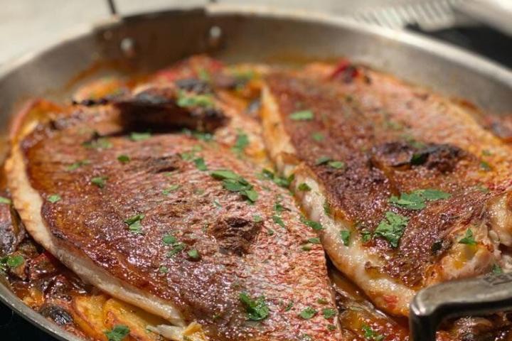 Rociar el pescado de Jerez fino, salpimentarlo y dar unas vueltas. Pasarlo a la bandeja de las verduras y patatas con la piel hacia arriba. Asar a 180°C durante 18 minutos. Una vez asado, rociar ligeramente con un poco de aceite de oliva y espolvorear de perejil picado y pimienta blanca.