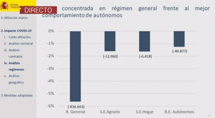 La mayor caída durante marzo la experimentó el régimen general, con 855.081 empleos menos, seguido por el de autónomos, que perdió 40.877.