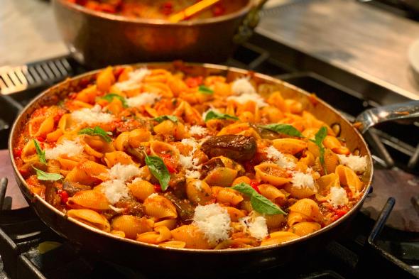 Mientras, cocer la pasta como ya he explicado varias veces y a falta de 2 minutos pasar la pasta a la salsa pomodoro con la ayuda de un cazo de rejilla para que nos caiga un poco de agua de cocer la pasta y así dejar la salsa mas ligera y poder cocer 2 minutos más la pasta en la salsa, añadir en esos 2 últimos minutos la berenjena frita, ¾ partes de albahaca y ¾ partes de queso ricotta. Remover, pasar a una fuente y terminar espolvoreando el resto de albahaca, queso y unas vueltas de pimienta negra.