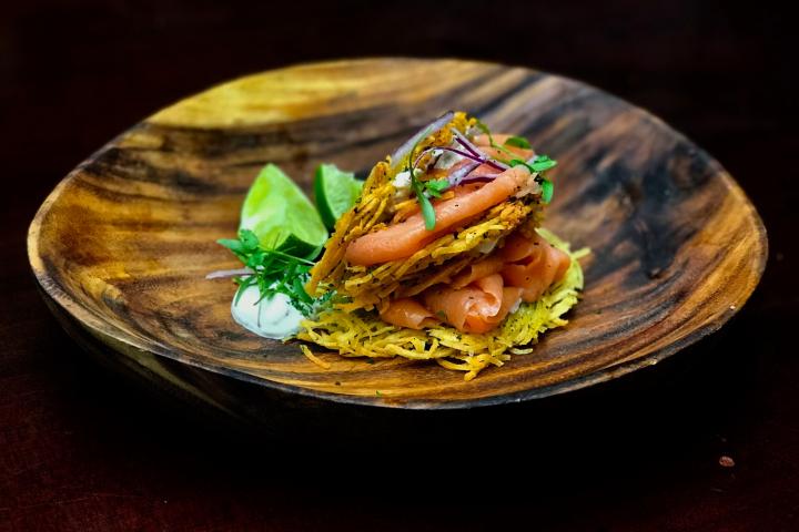 Patatas rösti con salmón ahumado y crema de cilantro