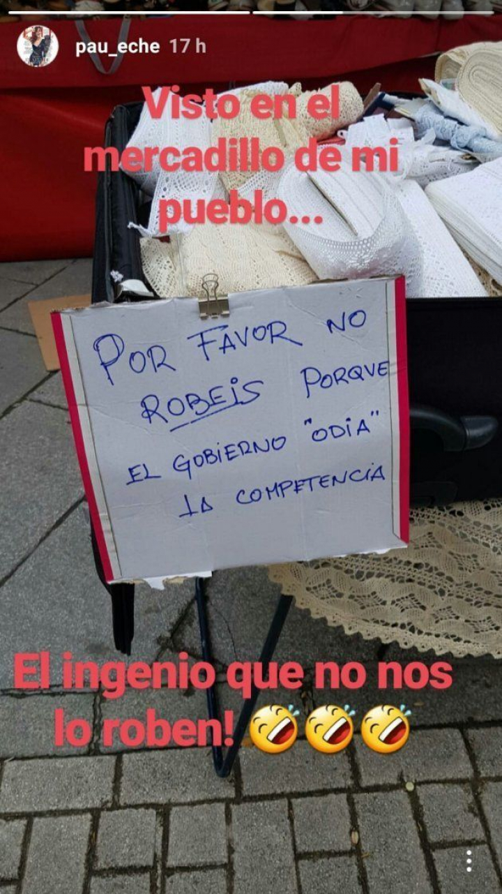 "Visto en el mercadillo de mi pueblo", rezaba un texto, que acompañaba un cartel en el que se podía leer: "Por favor no robéis porque el Gobierno odia la competencia".