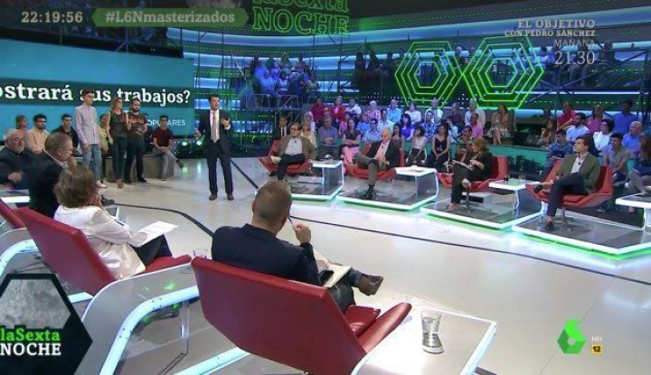 "Vamos a tranquilizarnos", trataba de templar gaitas López, que quiso dar voz a un grupo de estudiantes de la Universidad Rey Juan Carlos que se encontraban en el plató para hablar sobre el asunto del que versaba la tertulia.