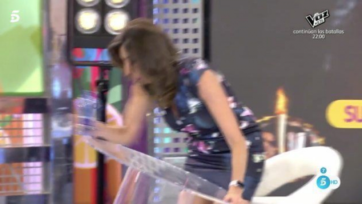 Tanto fue el cántaro a la fuente que la mesa cedió y la presentadora casi se lleva un buen susto.