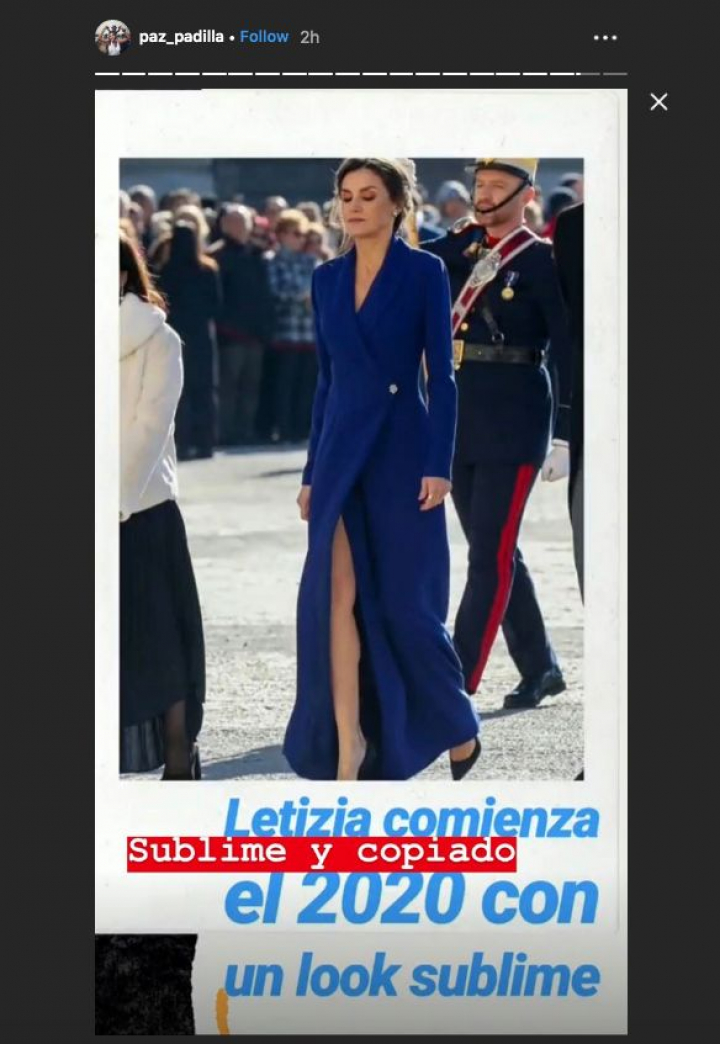 Aún no ha trascendido de qué firma es el vestido, aunque la presentadora Paz Padilla ha señalado un parecido más que razonable. A través de Instagram Stories la presentadora de Sálvame (Telecinco) ha compartido el titular de una noticia sobre el estilismo de la reina: “Letizia comienza el 2020 con un look sublime”.