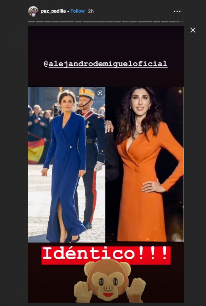 En su siguiente historia, Paz Padilla ha compartido una imagen suya con un vestido de Alejandro de Miguel en color naranja muy parecido al de la reina.