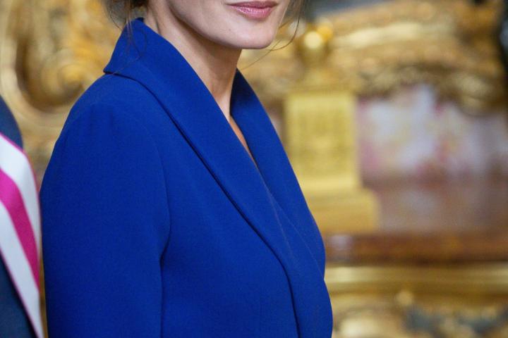 La reina Letizia estrenó su agenda oficial de 2020 este lunes en la Pascua Militar con un aplaudido vestido de color azul intenso con silueta wrap, escote en pico y abertura lateral en la falda, cuello de solapas y cierre lateral mediante un botón plateado con forma de flor.