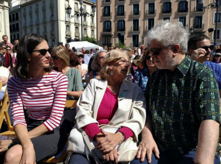 En su intento de revalidar la Alcaldía Carmena ha contado con el más internacional de los cineastas españoles. Pedro Almodóvar ha acudido a la plaza de Ópera para apoyar a la exmagistrada, a quien admira ‘muchísimo’ desde que ésta como abogada laboralista le defendió en el 76, cuando le querían echar de ‘la Telefónica’ por haber ido a la huelga.