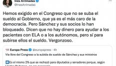 “Hemos exigido en el Congreso que no se suba el sueldo al Gobierno, que ya es el más caro de la democracia”, ha escrito Arrimadas antes de añadir: “Pero Sánchez y sus socios lo han bloqueado. Dicen que no hay dinero para ayudar a los pacientes con ELA o a los autónomos, pero sí para subirse ellos el sueldo. Vergonzoso”.