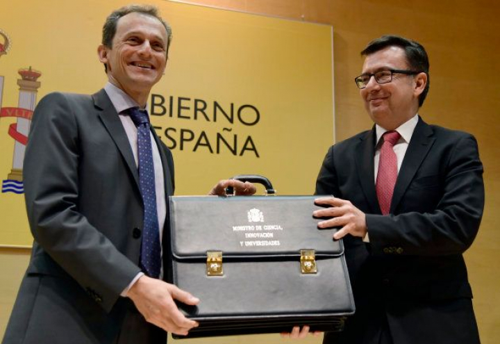 El ministro de Ciencia, Pedro Duque, y el exministro de Economía, Román Escolano.AFP/Getty Images