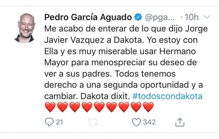 Un comentario que también ha dolido a Pedro García Aguado, quien ha contestado desde su cuenta de Twitter: “Me acabo de enterar de lo que dijo Jorge Javier Vázquez a Dakota. Yo estoy con ella y es muy miserable usar Hermano Mayor para menospreciar su deseo de ver a sus padres. Todos tenemos derecho a una segunda oportunidad y a cambiar. Dakota dixit”.