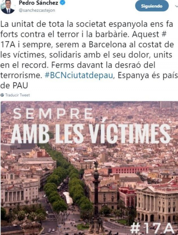 El presidente del Gobierno, Pedro Sánchez, ha publicado este viernes dos tuits para recordar a las víctimas del doble atentado en Cataluña del año pasado. Un estaba escrito en castellano y el otro en catalán... Pero entre ambos mensajes había más diferencias.