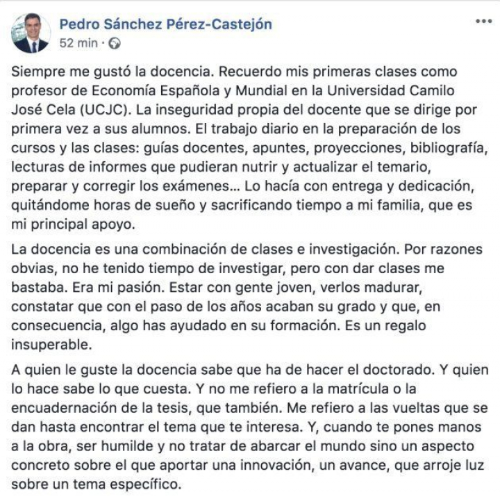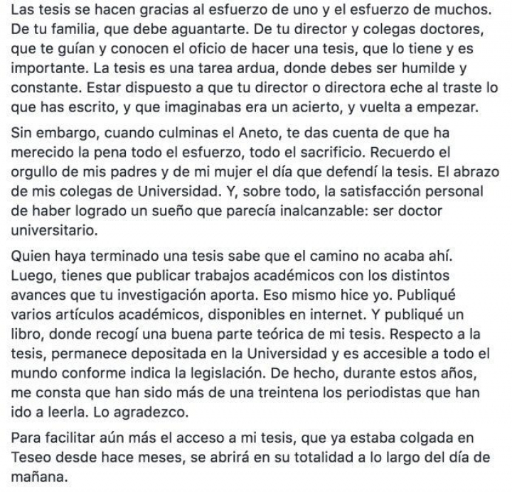 El presidente ha anunciado la digitalización de su trabajo académico en un post de Facebook y ha defendido su trabajo académico: "Hice la tesis, cumplí con todos los pasos marcados por la ley, la defendí ante un tribunal, publiqué las aportaciones de la investigación en revistas académicas y en un libro generalista".