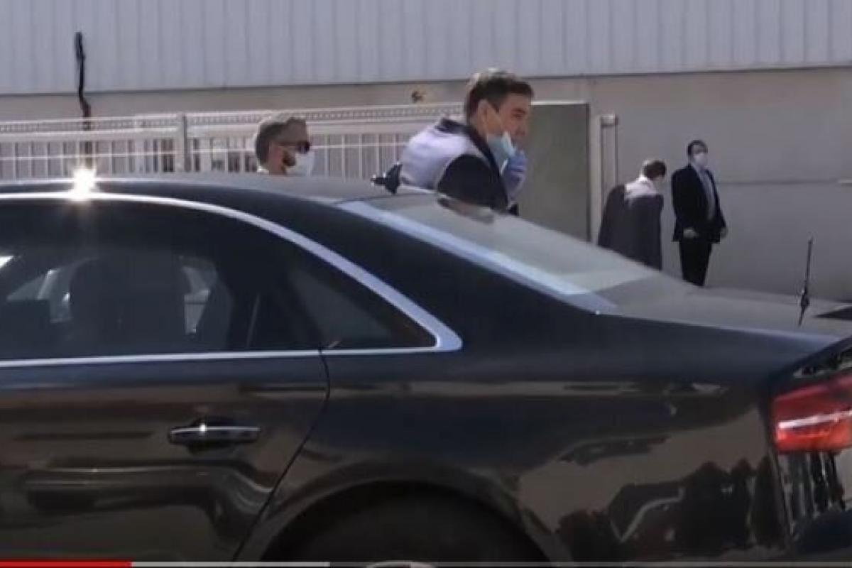 Una imagen del presidente del Gobierno antes de entrar en la fábrica ha desatado las alarmas. El jefe del Ejecutivo salió del coche con la mascarilla puesta, pero se la bajó para hablar brevemente con los periodistas.