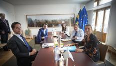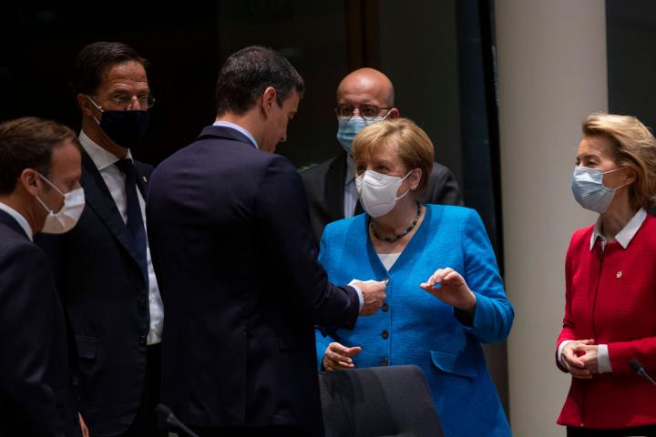 Las imágenes muestran a Sánchez sin mascarilla conversando con el primer ministro holandés y las fotografías también le captaron haciendo lo propio con el resto de líderes: