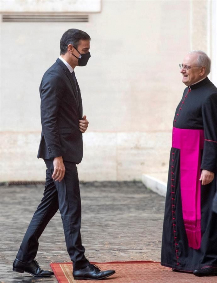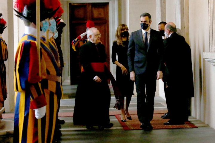 Sánchez ha ido acompañado de su esposa, Begoña Pérez, y ambos, con su mascarilla puesta, han llegado en una berlina de marca Masserati facilitada por el Gobierno italiano, algo habitual en estas ocasiones, hasta el patio de San Dámaso desde el que se accede al Palacio Apostólico.