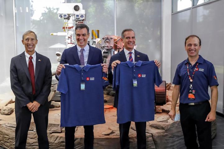 Desde el centro de control, Sánchez ha visitado otras dependencias, y ante una reproducción del robot Perseverance utilizado en la misión Marte 2020, ha sido informado de sus pormenores. Tras recibir como regalo una camiseta con el logo de esa misión, el presidente del Gobierno ha conocido el museo del JPL y ha conversado con el grupo de ingenieros españoles que trabajan en este centro de la NASA y que le han dado detalles de su labor