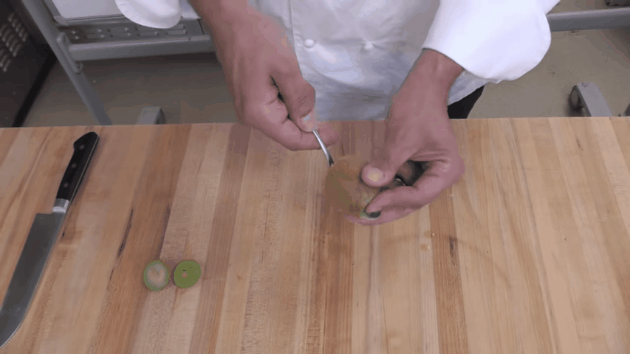 En realidad basta medio minuto, una cuchara y un cuchillo para pelar el kiwi y que salga perfecto, sin desperdiciar parte de la fruta. Lo demuestra este vídeo de Worldwide Culinary Apprentice.