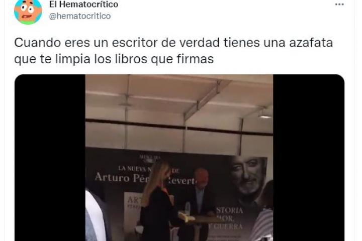 Esta escena fue grabada y difundida en redes sociales, en las que Pérez-Reverte fue duramente criticado. “Cuando eres un escritor de verdad tienes una azafata que te limpia los libros que firmas”, publicó un tuitero junto al vídeo, que ya supera las 300.000 reproducciones.