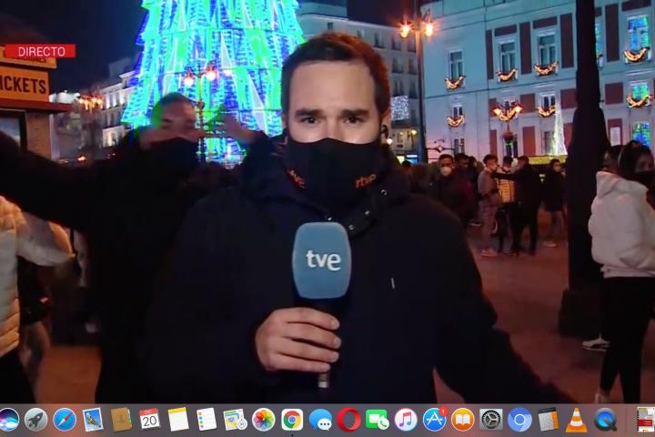 El periodista de TVE Adrián Arnau ha compartido en su cuenta de Twitter el momento que vivió este viernes por la noche en la Puerta del Sol de Madrid mientras realizaba un directo para el Telediario.