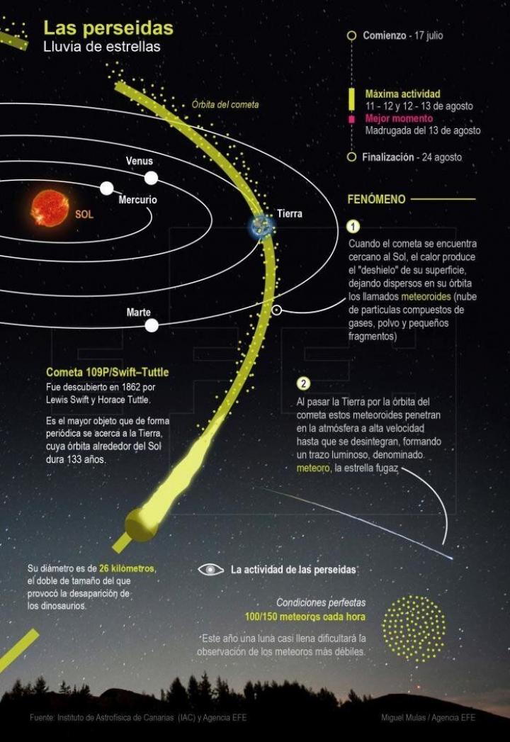 Cada año a principios de agosto, la Tierra cruza la órbita del cometa ’109P/Swift-Tuttle’, que tiene un periodo de 133 años y que pasó cerca del Sol por última vez en 1992. Esta órbita está llena de partículas pequeñas, como granos de arena o menores, que han sido liberadas por el cometa en sus pasos anteriores. Cuando una de estas partículas, que formaron en su día la cola del cometa, entra en la atmósfera terrestre a gran velocidad, la fricción la calienta hasta vaporizarla a gran altura.