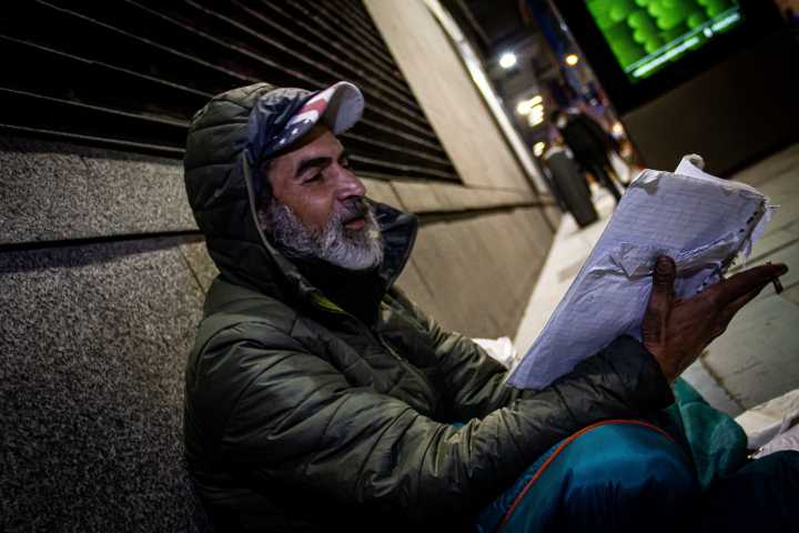 Uno de los más conocidos por los alrededores es José Luis, 55 años. Lleva en la calle 17. Precisamente, por “la familia... distintas opiniones, ya sabes”, se limita a responder. Será la única vez en la que no le salgan las palabras. Tiene un vocabulario rico, ganas de hablar y, sobre todo, de que le oigan. Se reconoce escritor y de estirpe escritora, tanto que acaba mostrando un cuaderno con sus poemas. Tratan de Dios, de la existencia, del vacío.