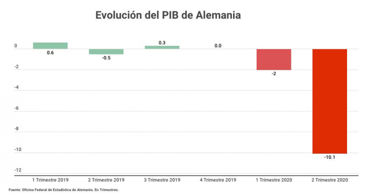 El producto interior bruto (PIB) de Alemania, la mayor economía europea, se hundió en el segundo trimestre de 2020 un 10,1% respecto de los tres meses anteriores por la crisis del coronavirus, cuando la locomotora europea había registrado ya una contracción del 2%, según la estimación preliminar publicada por la Oficina Federal de Estadística (Destatis).