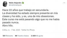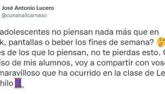 “Hoy hubo clase de Poesía, por estudiantes así no dejo la docencia”, escribió este usuario de Twitter acompañando ese mensaje con una foto en la que se veía lo que había escrito el alumno, que fue lo siguiente: