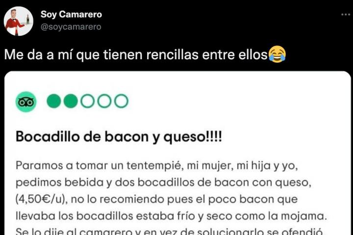 La cuenta Soy Camarero, que se encarga de publicar contenido relacionado con el mundo de la hostelería, se ha hecho eco en Twitter tanto de la reseña de un comensal como de la particular respuesta que ha recibido.