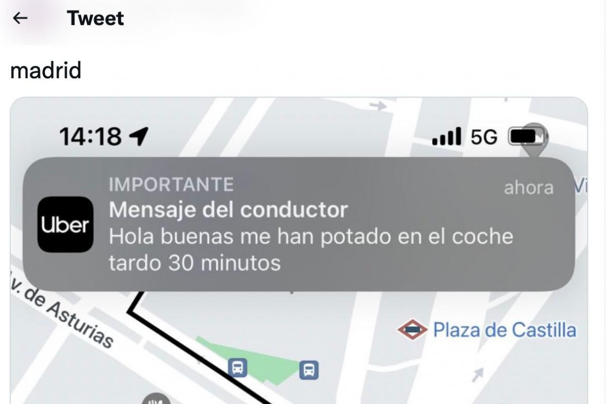 Pide un Uber en Madrid y el mensaje que recibe del conductor hace historia en Twitter